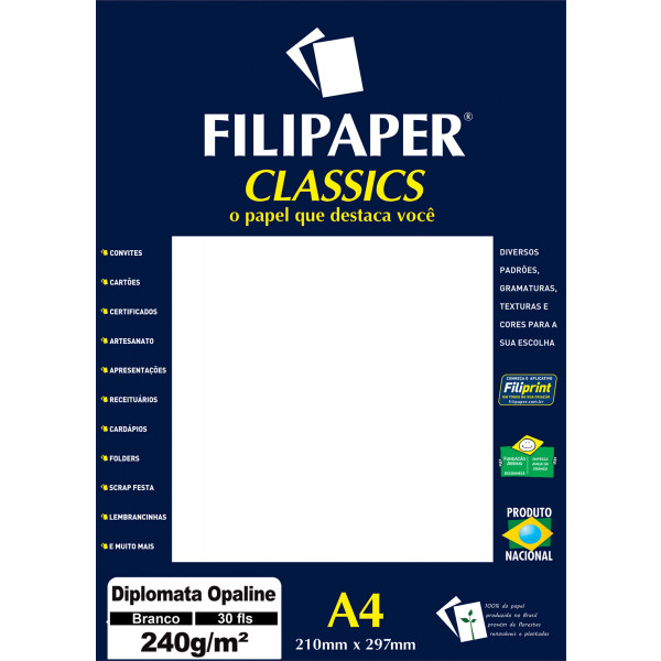 Gramatura: 240g/m² (30fls), na cor branco. Ideal para elaboração de convites, lembranças, cardápios, embalagens e outros.