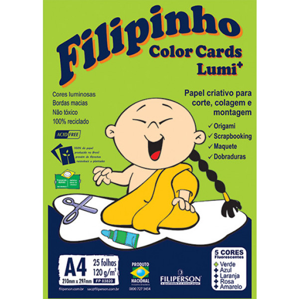 | Descrição Resumida | Filipinho Color Cards Lumi 120g tem formato A4 (21 X 29,7 cm) e embalagem com 25 folhas nas cores verde, azul, laranja, rosa, e amarelo. |